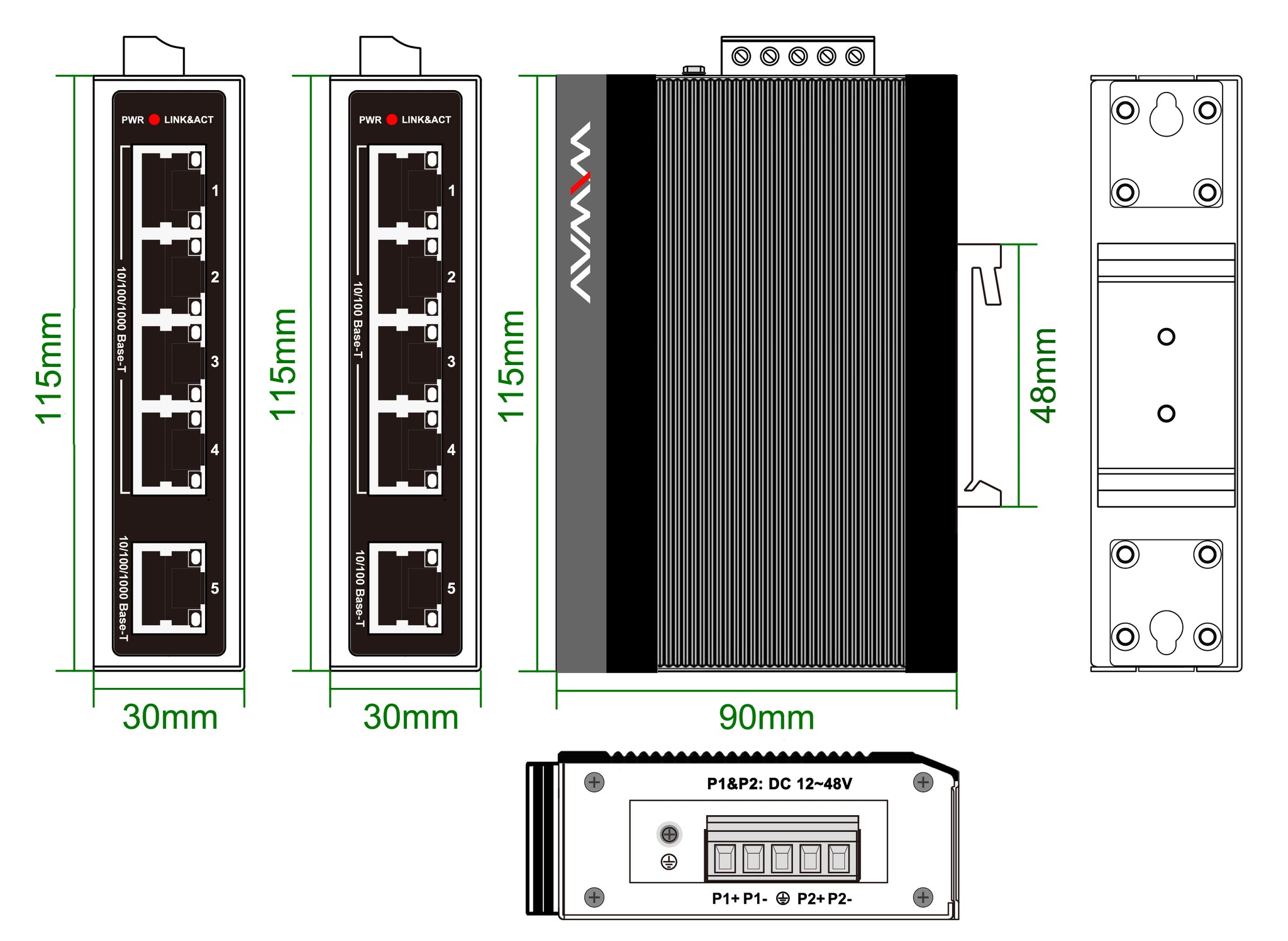 The WIWAV® W1105-5GE-I series up to 5 Ports Gigabit Ethernet devices through a rugged, energy-efficient, industrial 10/100/1000Mbps Ethernet switch for critical applications in hazardous environments, such as smart traffic, factory automation, and outdoor access connection for video surveillance / FTTx and Wi-Fi coverage.