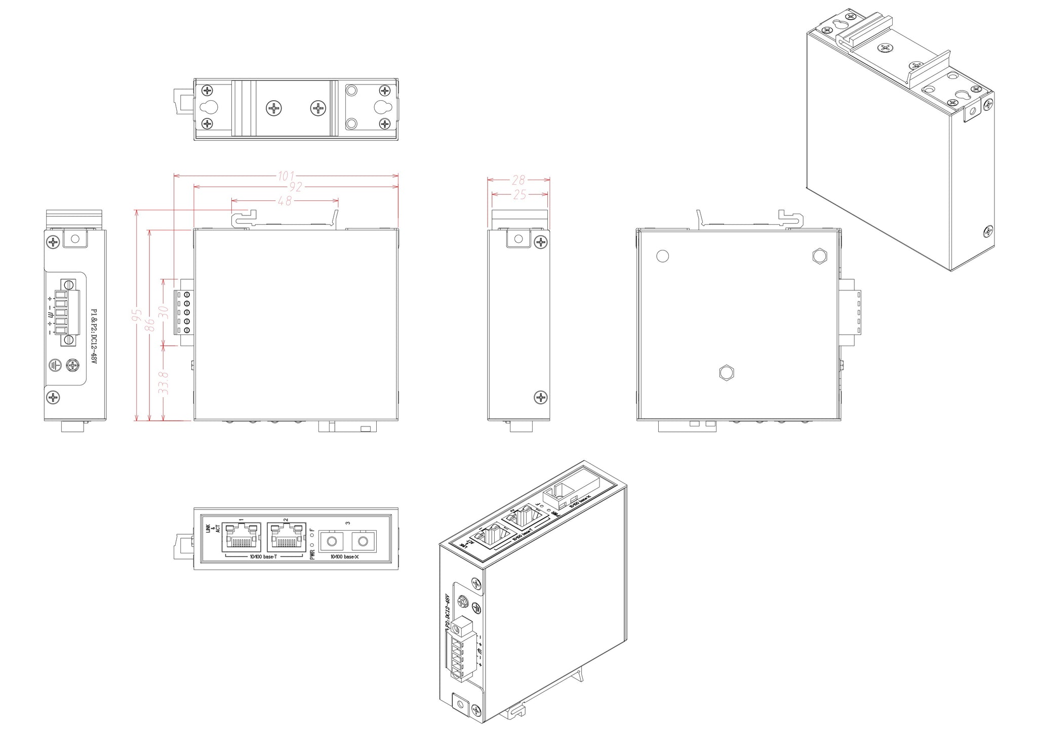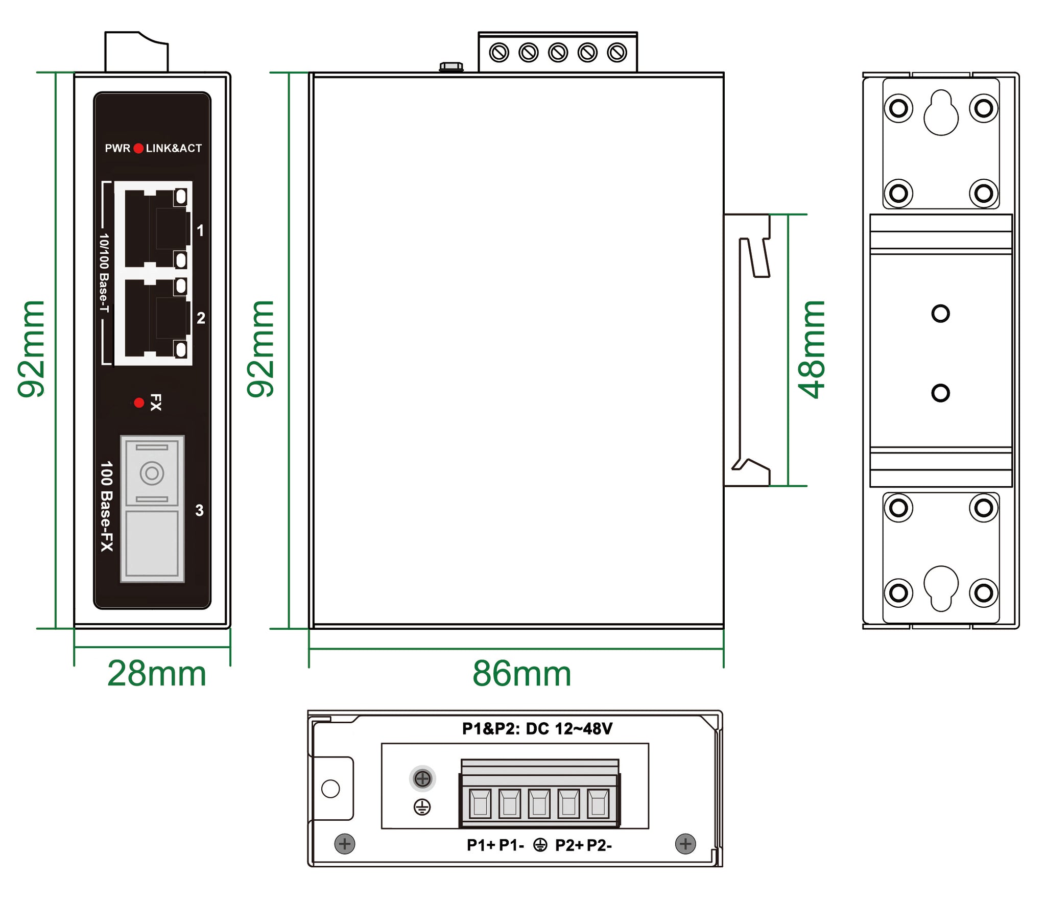 ● LOW POWER CONSUMPTION - Energy-Efficient Ethernet(Power Consumption <2 watts), 12~48V DC terminal block input